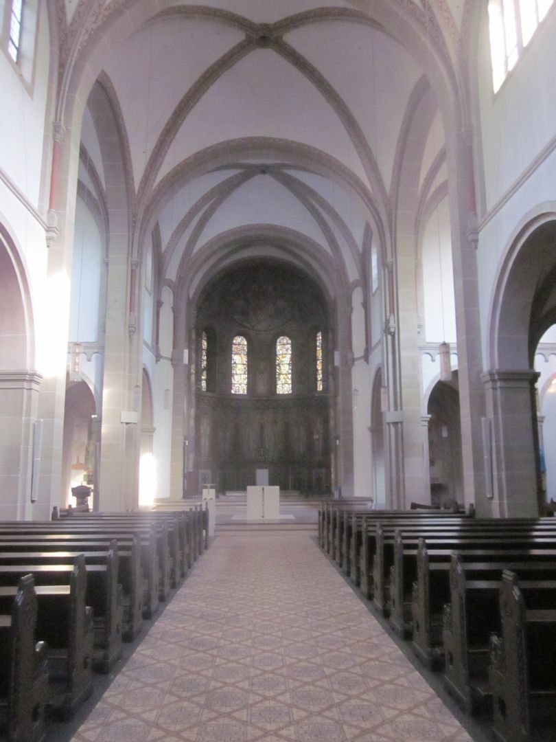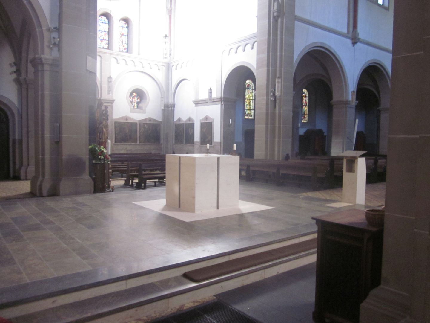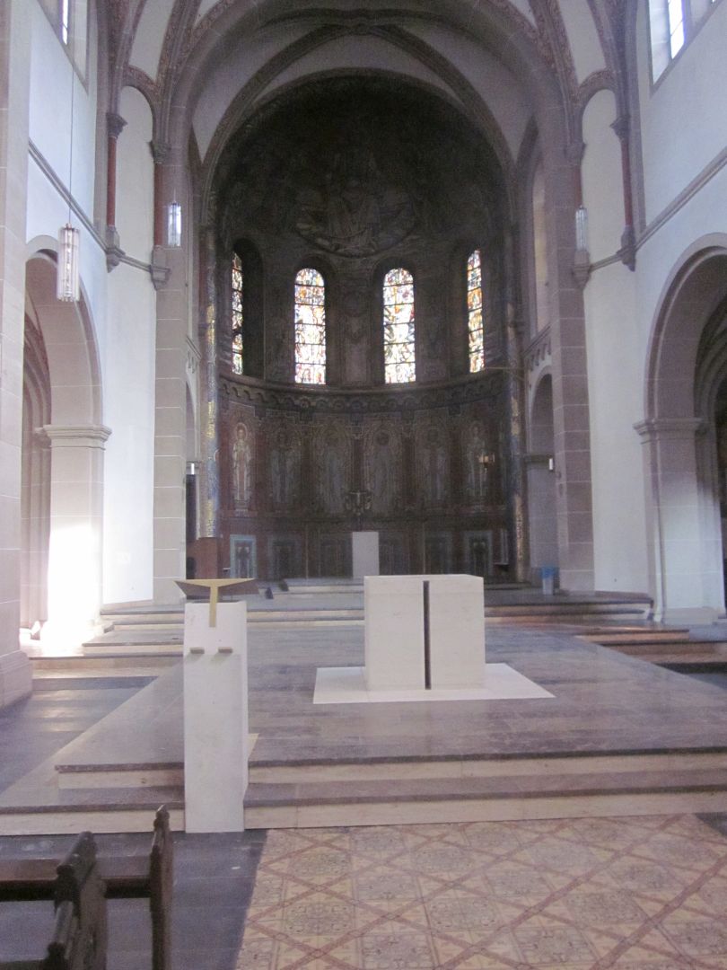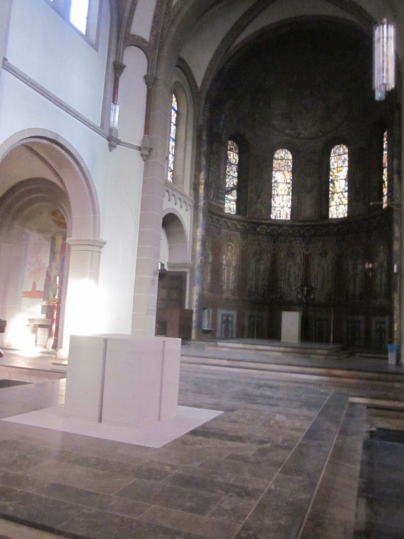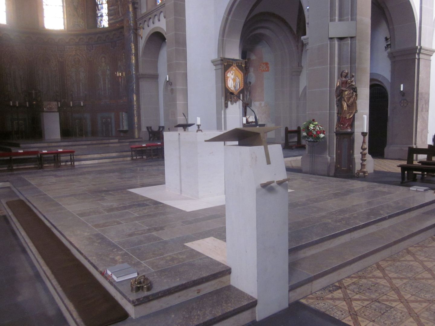 Altar und die Stufenanlage fügen sich wegen ihrer reduzierten Form ein in das historische Ensemble. Durch seine ruhige Gestaltung wird der Blick auf das kostbare Mosaik (ca. 1928) im Chor gelenkt.