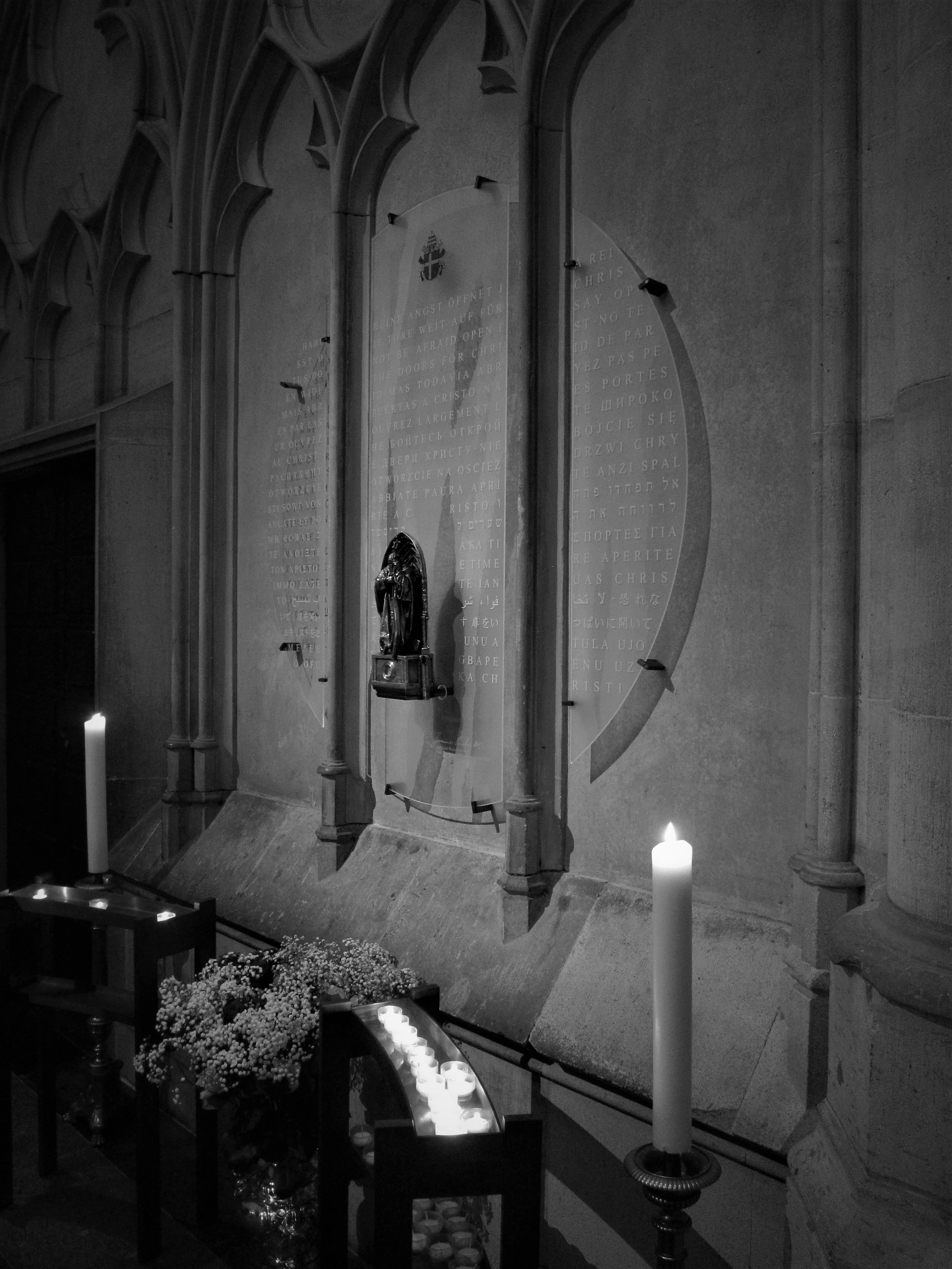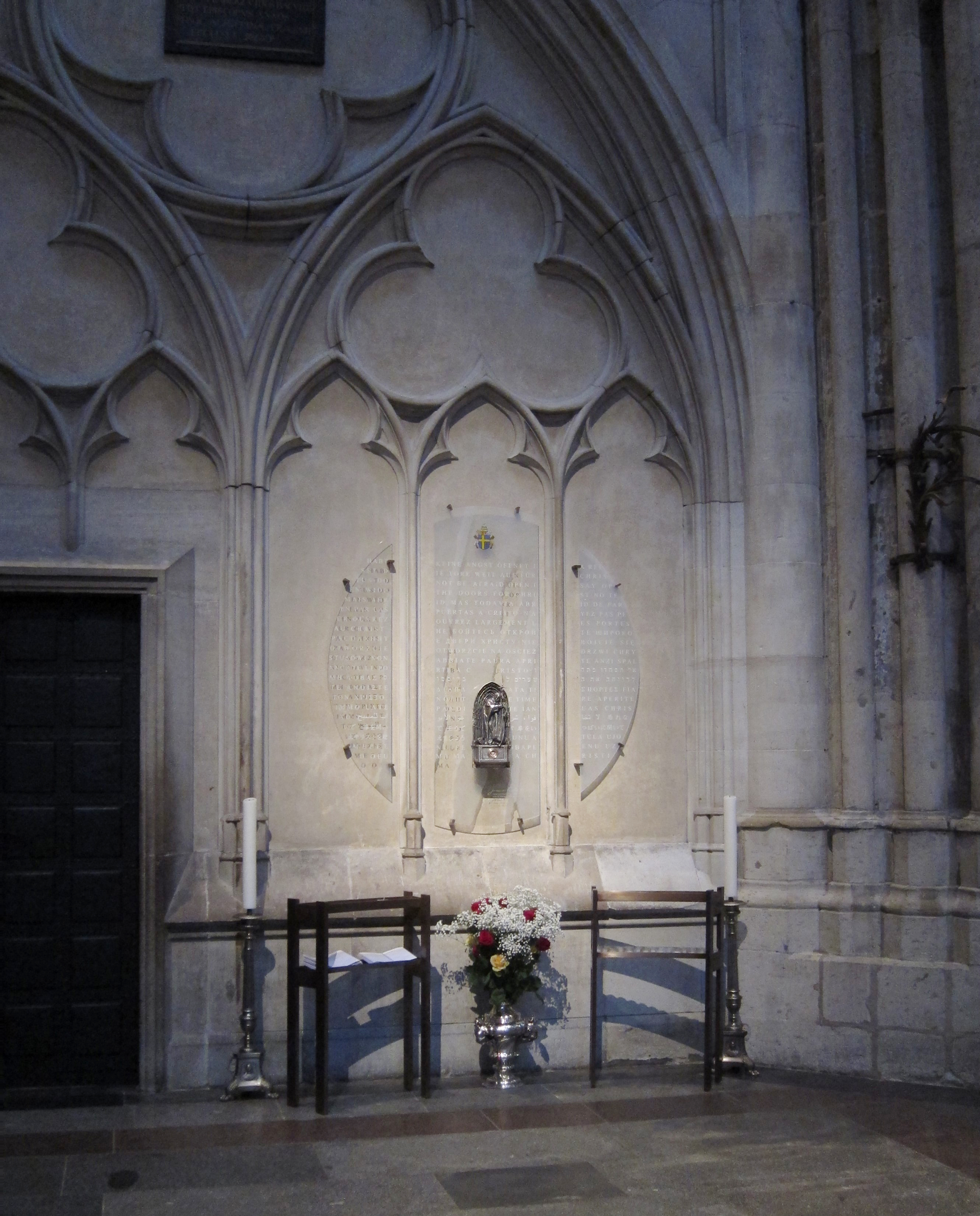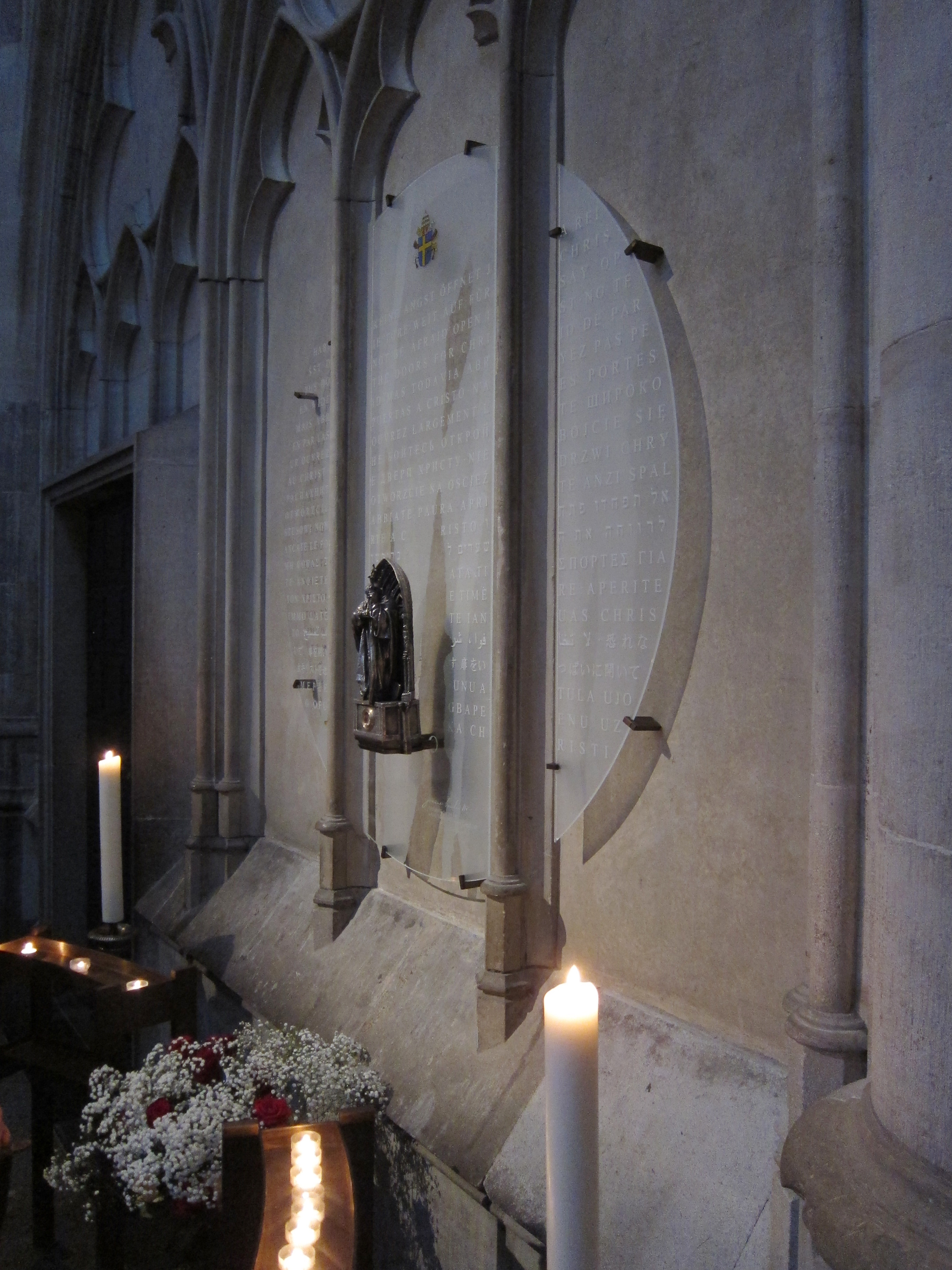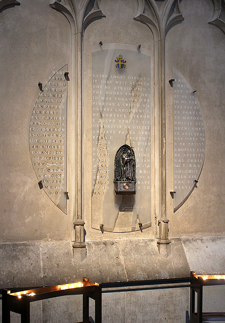 Vorne ist sie mit dem Wappen und der Unterschrift des Heiligen versehen und mit der programmatischen Überschrift seiner ersten Predigt, die er am Tage nach seiner Wahl zum Papst auf dem Petersplatz in Rom gehalten hat: „Habt keine Angst, reißt auf die Türe, ja reißt sie weit auf für Jesus Christus“.